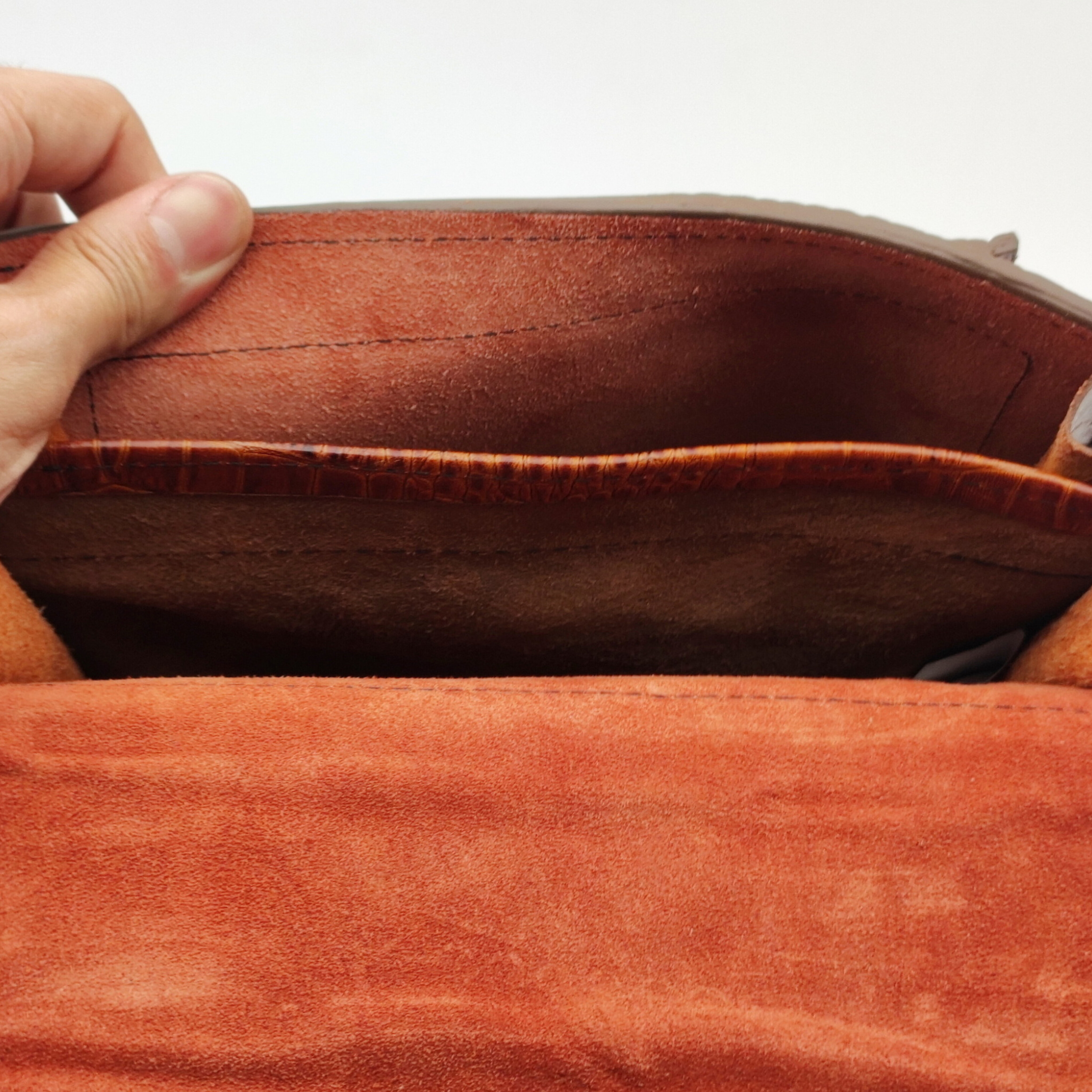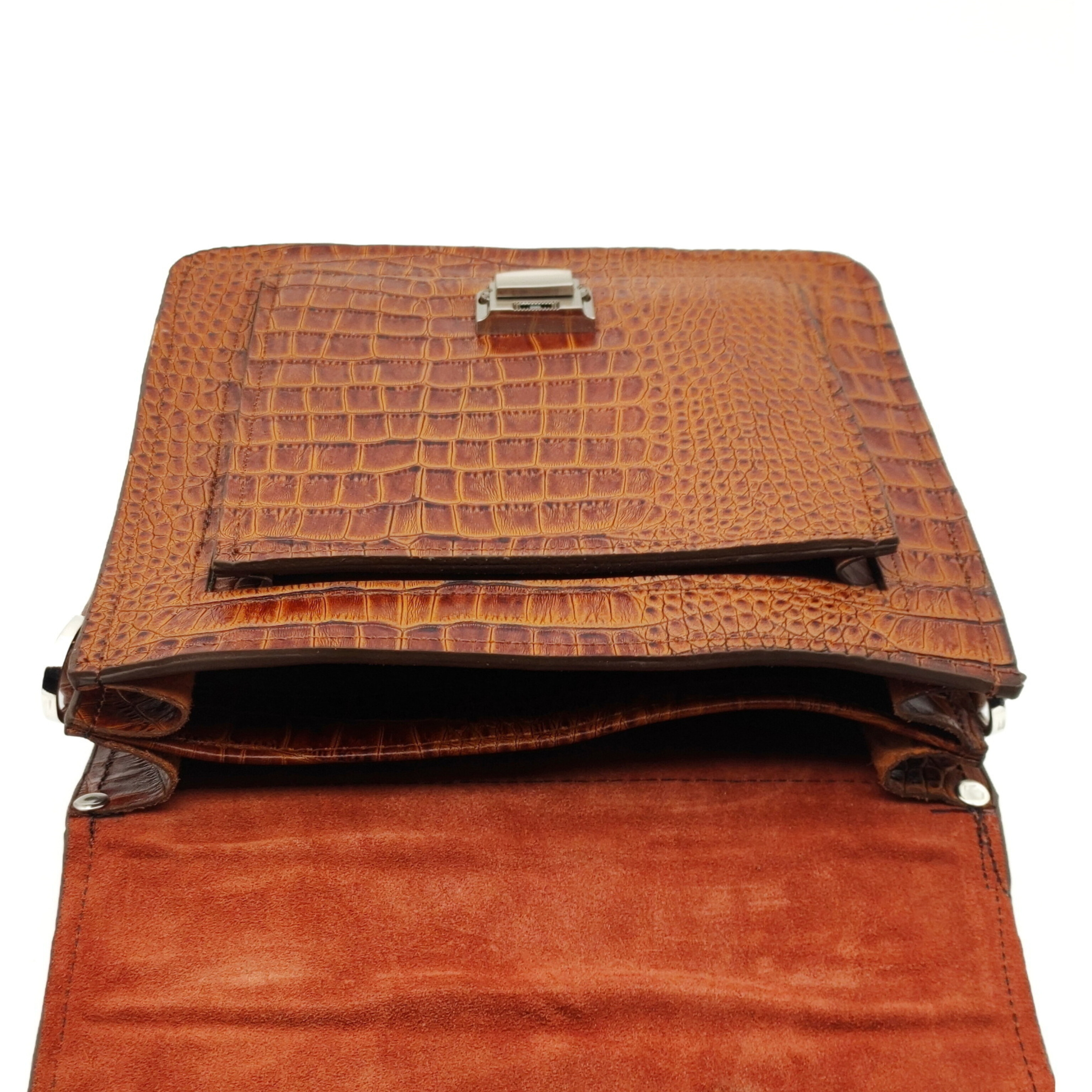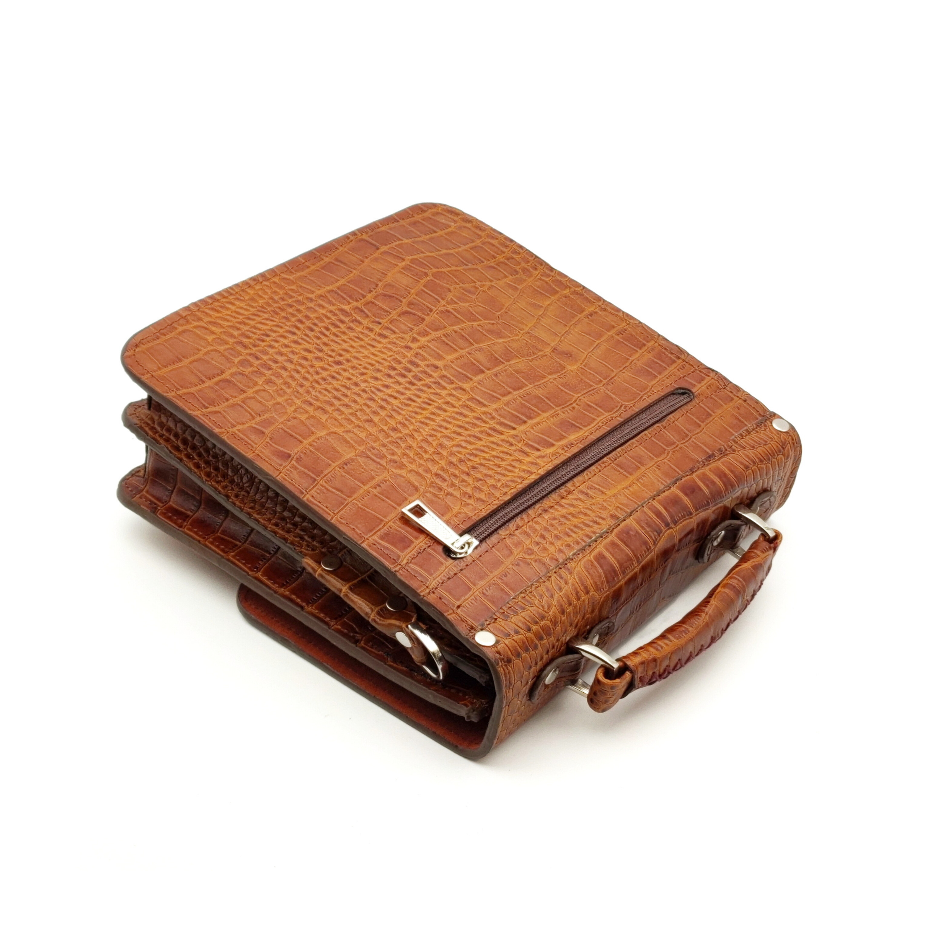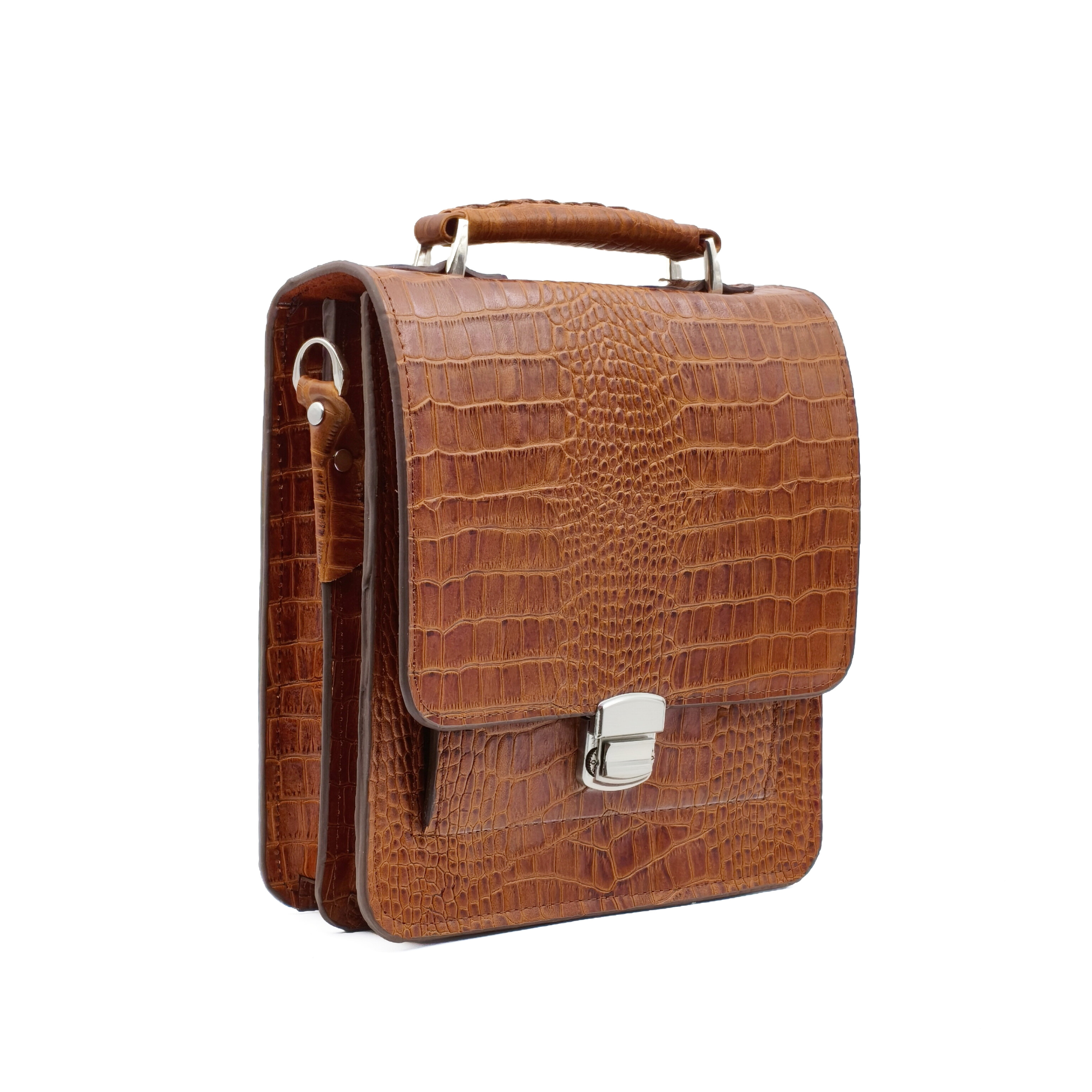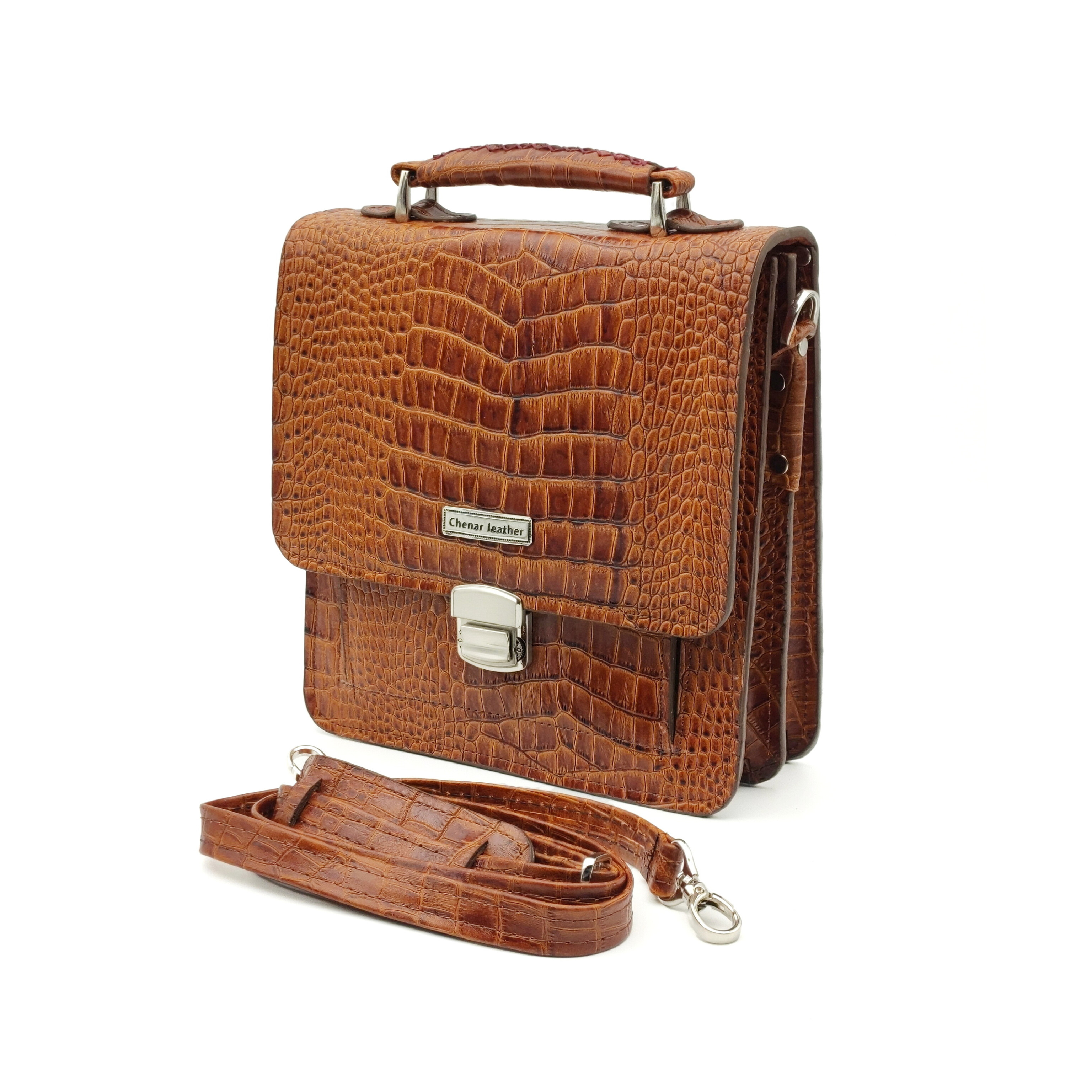 کیف نیم اداری دستی و دوشی چرم مردانه رویه کار چرم گاوی چاپ کروکودیلی کار شده داخل کار از اشبالت طبیعی گاوی کار شده یراق آلات فلزی خارجی رنگ ثابت می باشد دارای بند دوشی چرم دولایه مناسب استایل های رسمی و نیمه رسمی ، دارای قفل رمز دار که میتوانید رمز دلخواه خود را تنظیم کنید . این کار دو طبله است و انواع اقسام مدارک را میتوان باهاش به همراه داشت