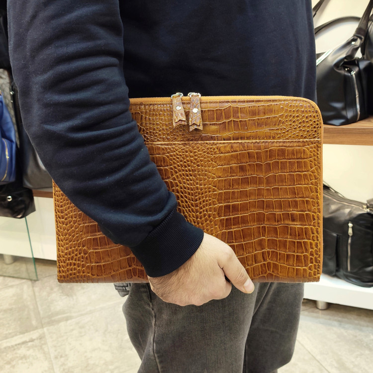 کیف فولدر کلاسوری چرم طبیعی تبریز ریواچرم تبریز چاپ کروکودیلی بسیار باکیفیت از لحاظ دوخت ، فرم قابلیت های منحصر بفرد که میتوان در محیط های اداری استفاده کرد آستری کار سوئیت خارجی میباشد ، زیپ فلزی وای کاکا ژاپنی داخل کار جای خودکار پوشه کاغذ a4 و... میتوان بهمراه داشت